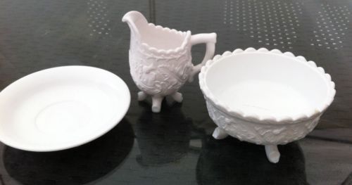 Title (ebay affiliate link): Antique Davidson Pressed Milk Glass Bowl Jug Saucer Thistle Shamrock Lily Valley