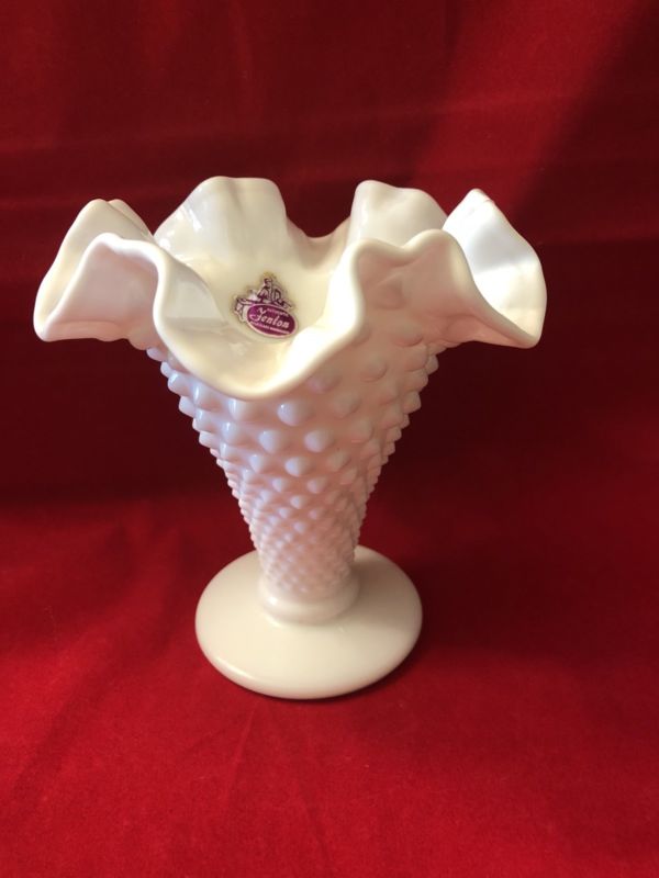 Title (ebay affiliate link): Fenton Hobnail Milk Glass Crimped Ruffled Edge Vase 5 1/2" Original Tag!