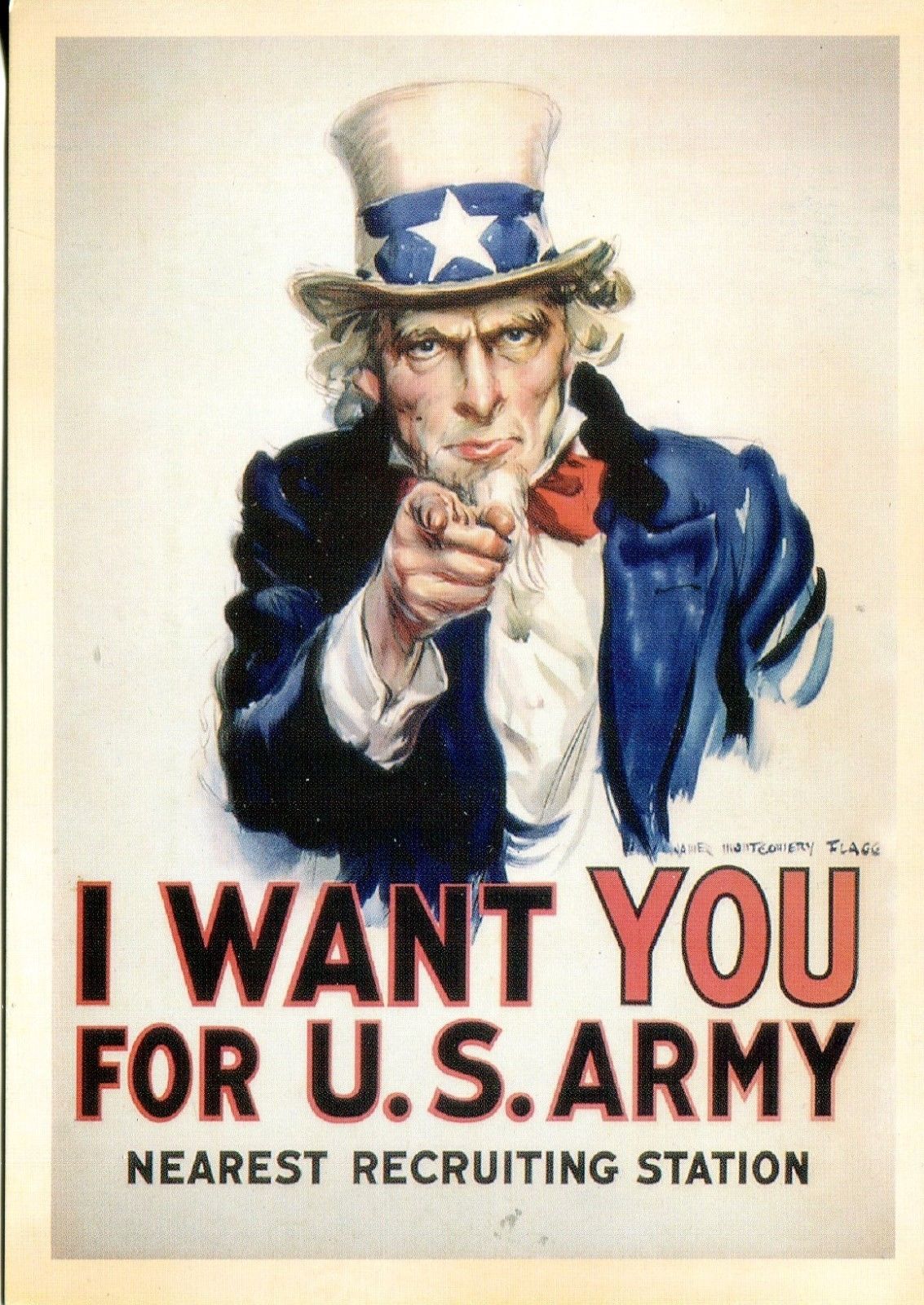 POST CARD WITH WORLD WAR II POSTER UNCLE SAM POINTING I WANT YOU FOR U.S. ARMY