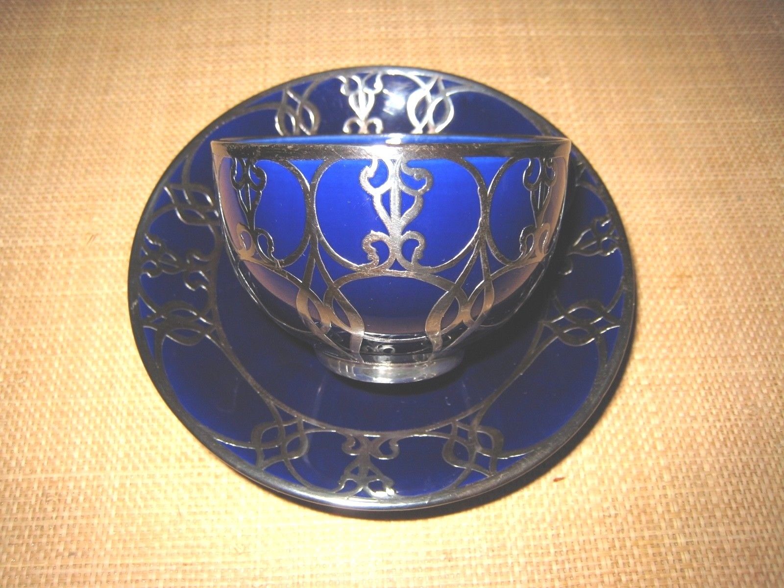 STERLING SILVER OVERLAY COBALT BLUE CUP AND SAUCER