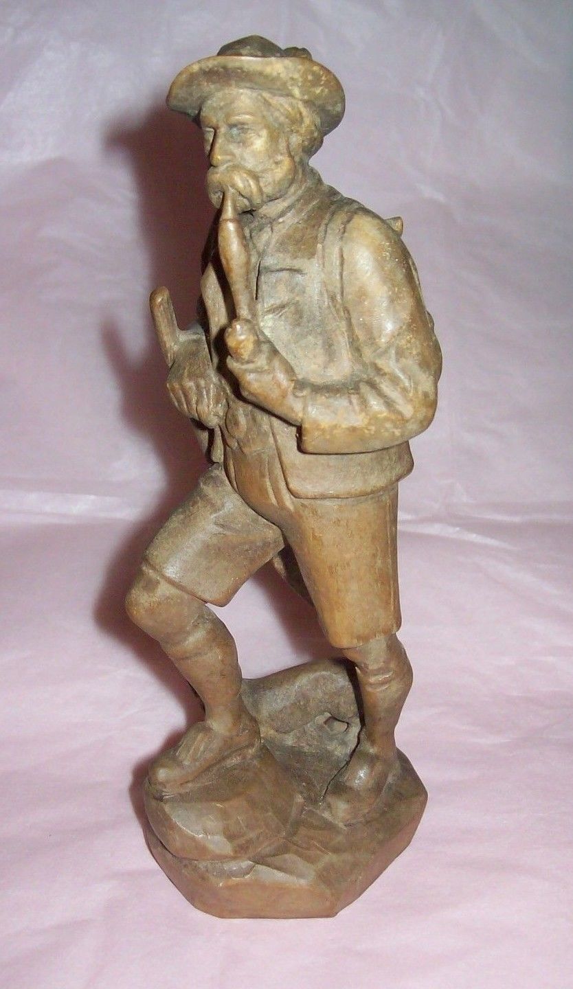 German Hand Carved Wooden Hunter with His Dog and Gun