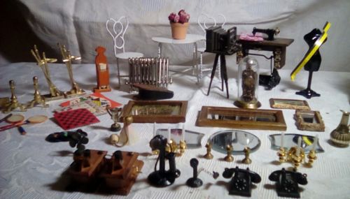 Title (ebay affiliate link): Huge 75+ pc dollhouse furniture decor 6 "antique" phones 3 rugs 5 pc family