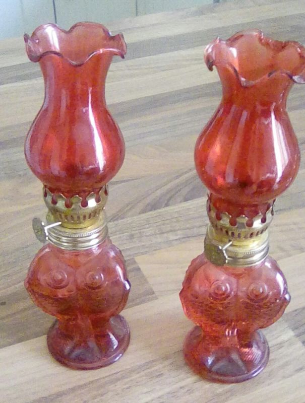 Title (ebay affiliate link): pair of vintage cranberry coloured oil lamps with fish detail 99p start n/r