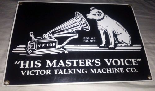 Title (ebay affiliate link): Victor, his Masters Voice talking machine co. Black and white enamaled sign