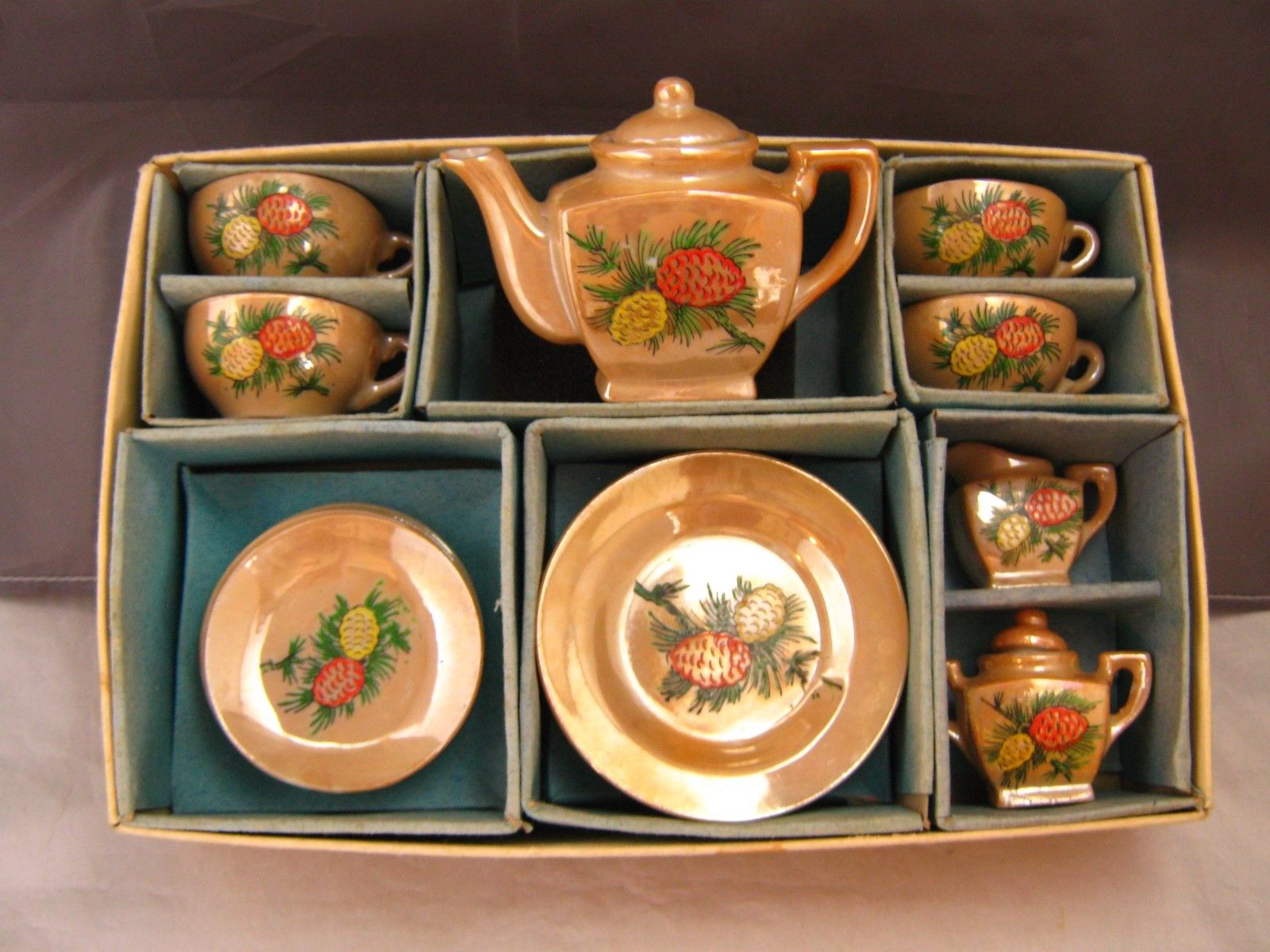 Title (ebay affiliate link): Child''s Toy Tea Set Peach Lusterware Pinecone Pattern 17 Piece with Flaws Japan