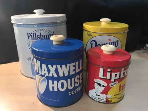 Title (ebay affiliate link): JL CLARK PILLSBURY FLOUR DOMINO SUGAR MAXWELL COFFEE LIPTON TEA TIN CANISTER SET