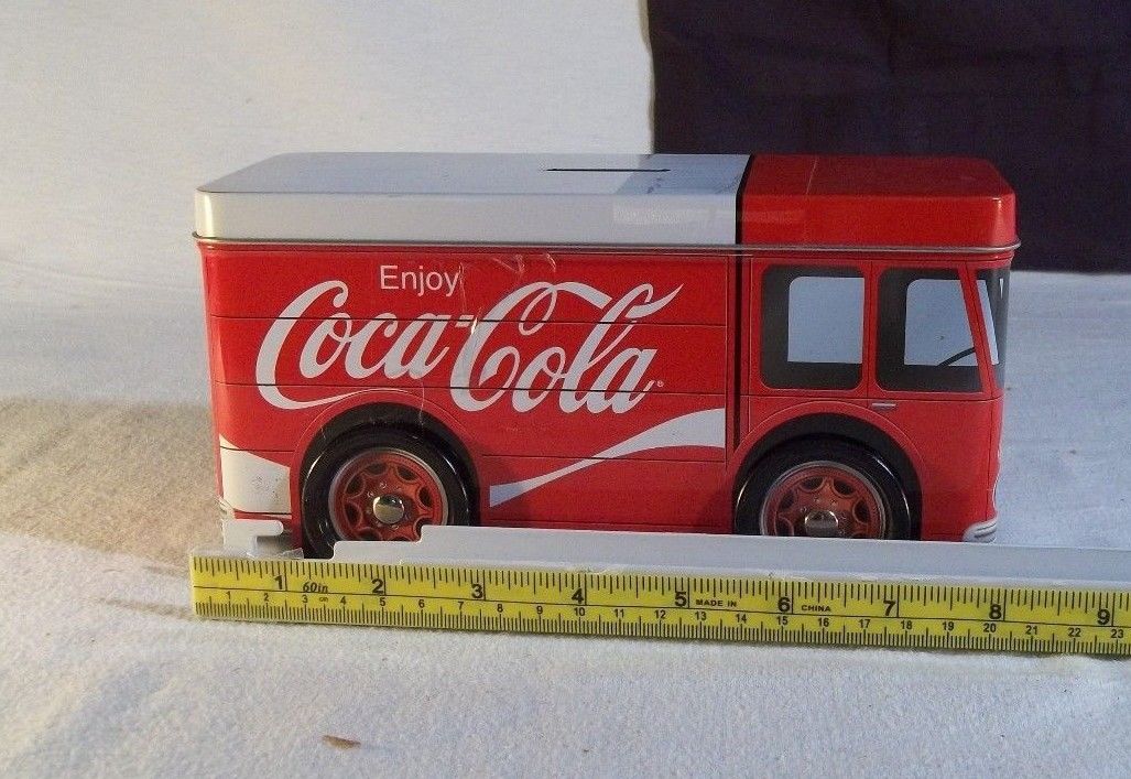 Title (ebay affiliate link): Coke Coca Cola Metal Tin coin money bus truck bank moving wheels red