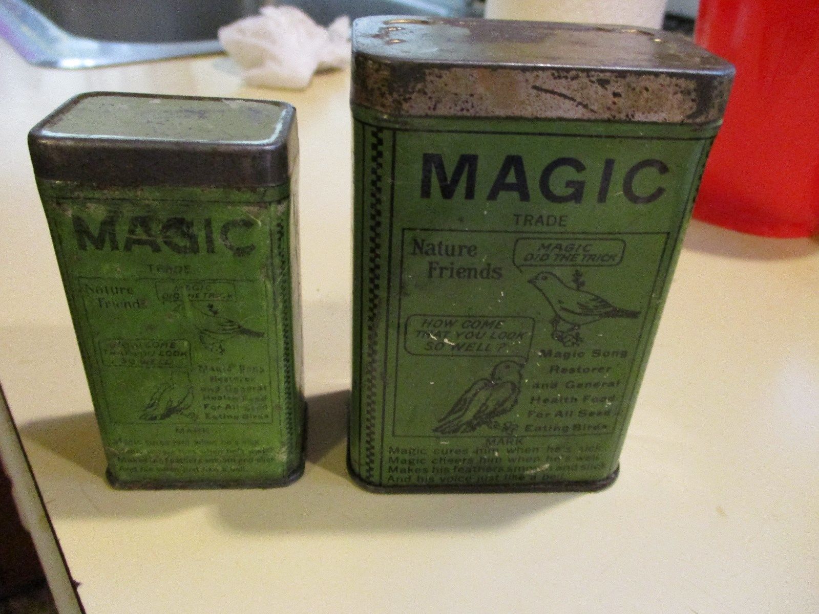Title (ebay affiliate link): 2 Old MAGIC Song Restorer and Health Food Nature Friend Bird Seed Medicine Tin