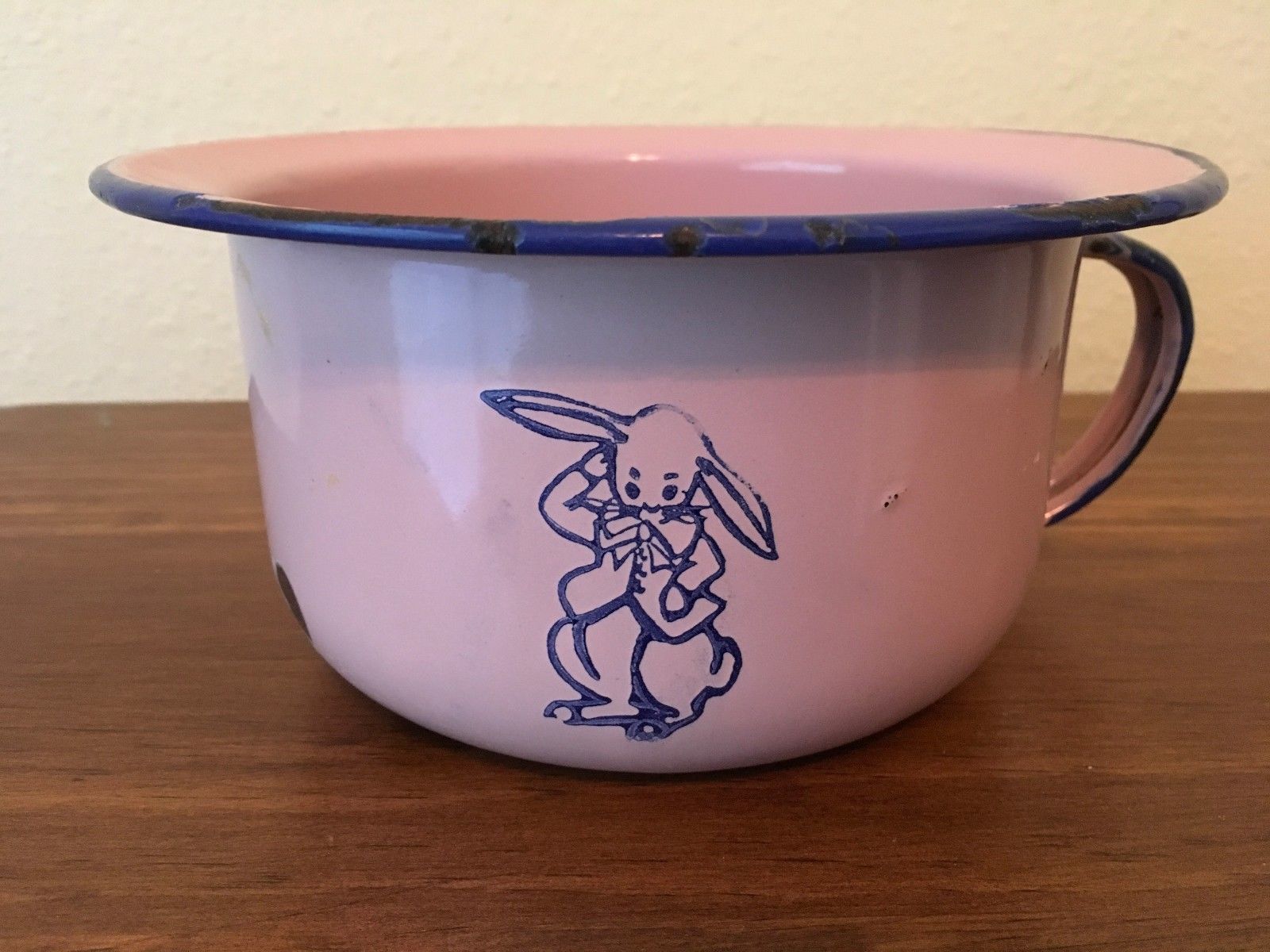 Title (ebay affiliate link): Vintage Child''s Doll Enamel Pink W/ Cobalt Blue Trim Chamber Pot W/ Bunny