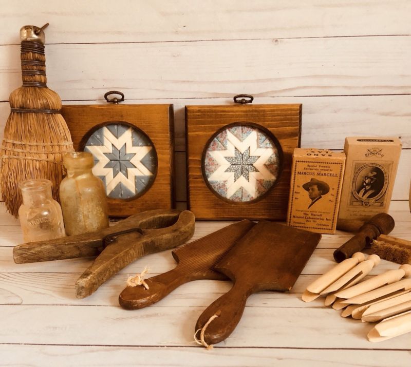 Title (ebay affiliate link): Vintage Lot Farmhouse Decor Quilt Pictures Wood Clamps Old Bottles Wisk Broom