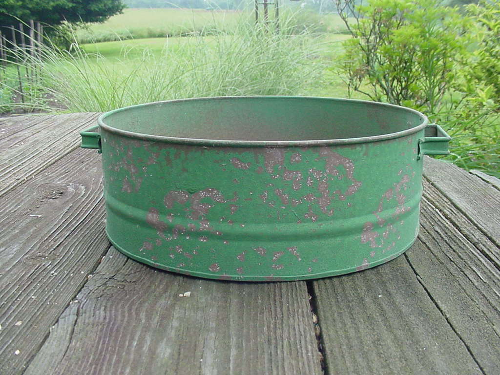 Title (ebay affiliate link): TWO HANDLED TIN PAN - GREEN WITH A PINK BACKGROUND - 11 1/2" D. - UNKNOWN USE
