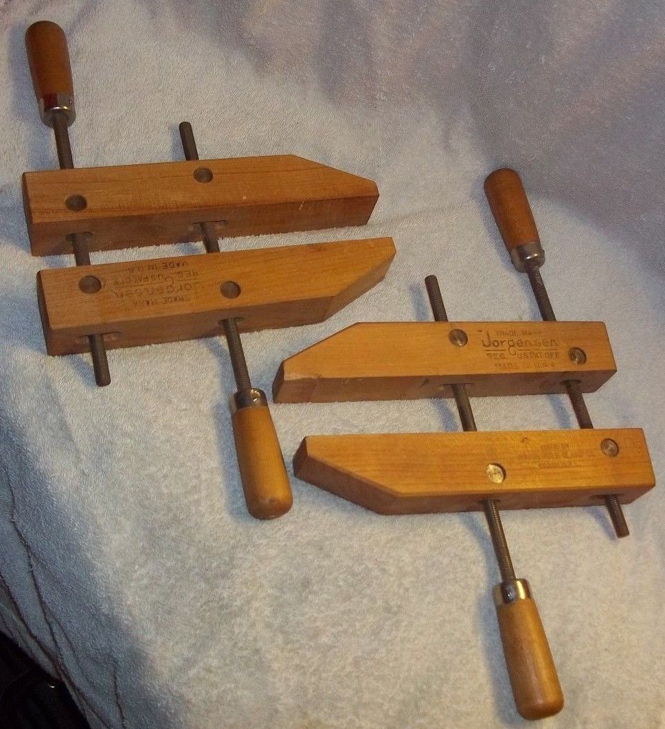 Title (ebay affiliate link): 2 VINTAGE Jorgensen Handscrew Wood Vises Clamps Adjustable Clamp Co. Chicago 10"