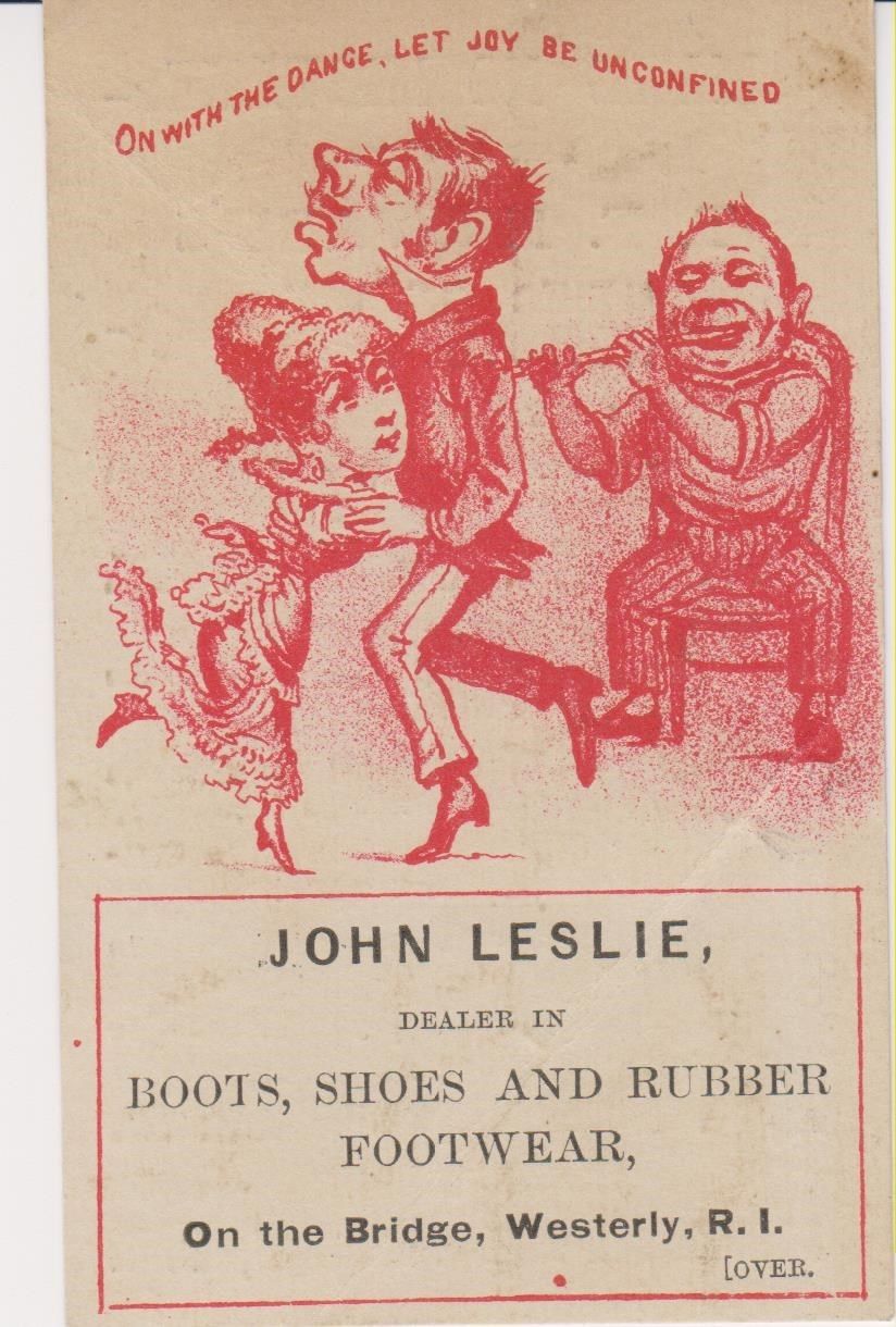 Westerly RI Victorian Trade Card, 1880s, Boots & Shoes, John Leslie