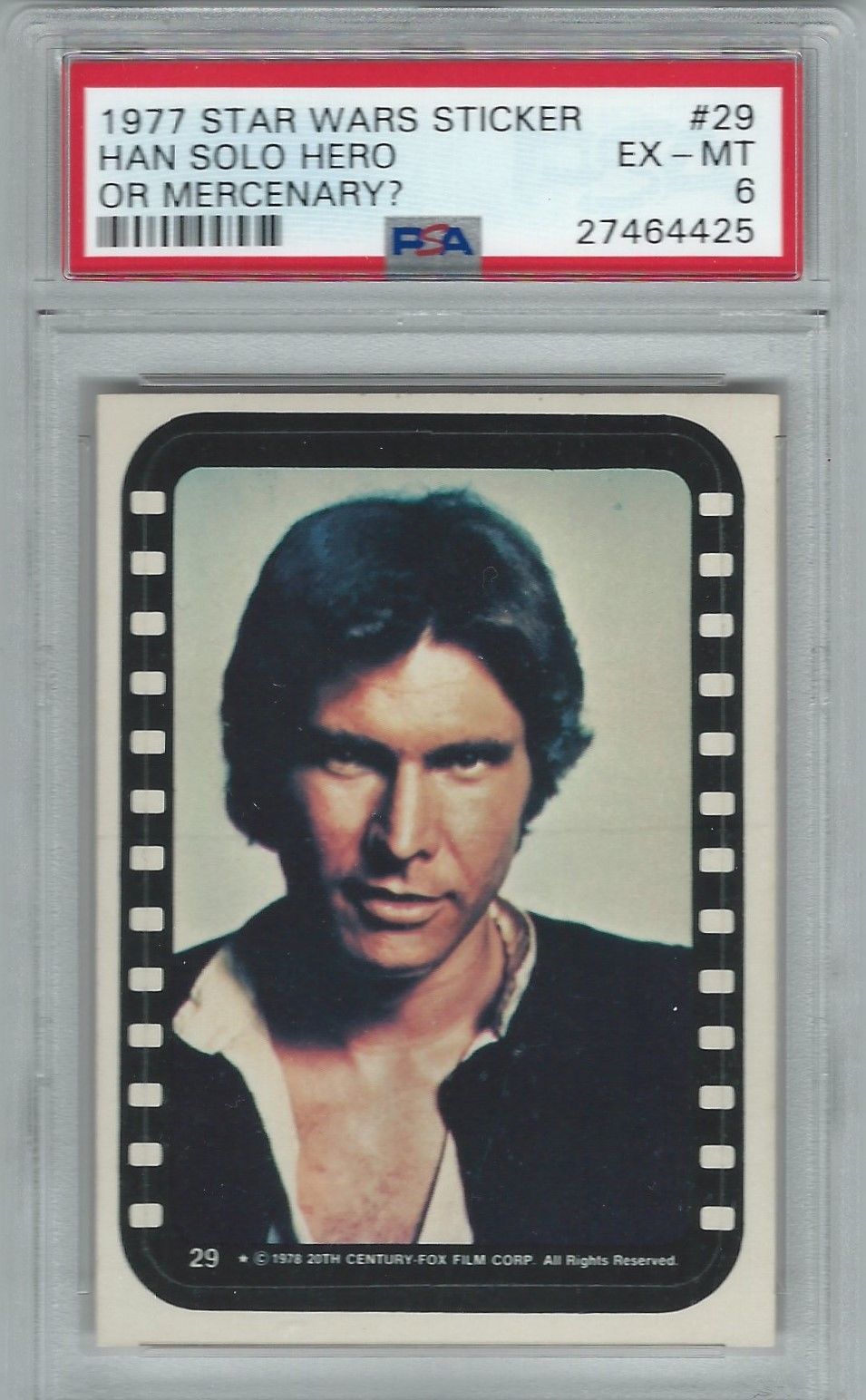 Title (ebay affiliate link): 1977 Star Wars Sticker #29 HAN SOLO HERO OR MERCENARY? - PSA 6 EX-MT