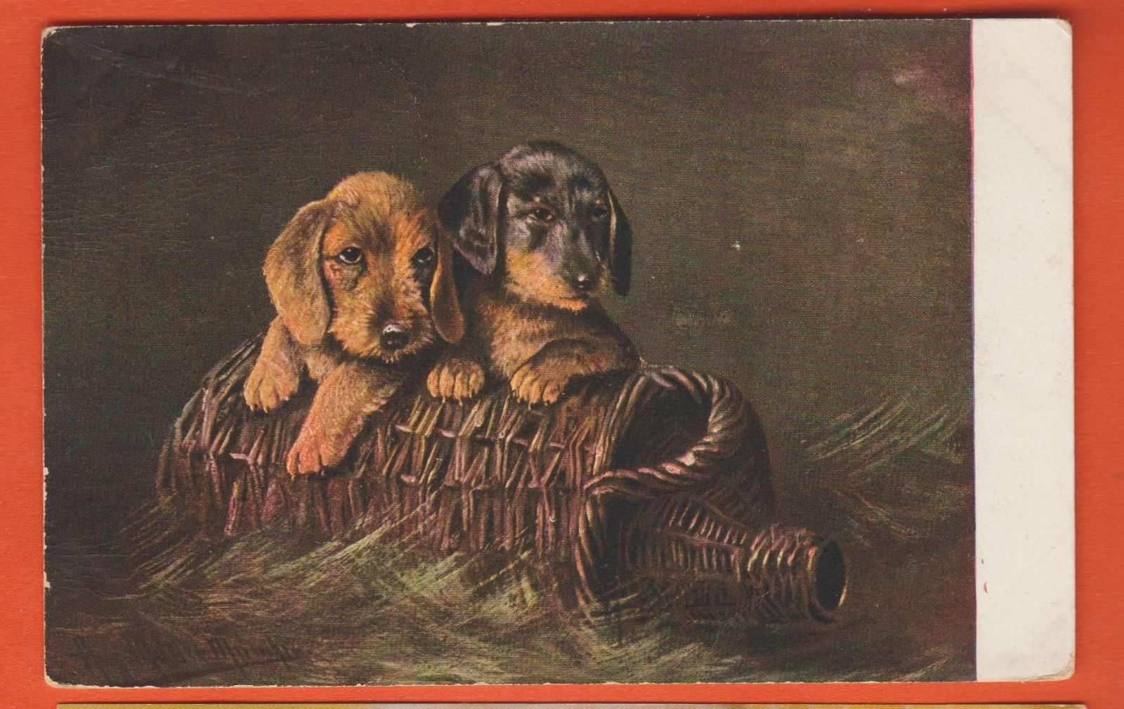 Cute puppies/ 2 terriers on wicker bottle holder/ non-linen postcard
