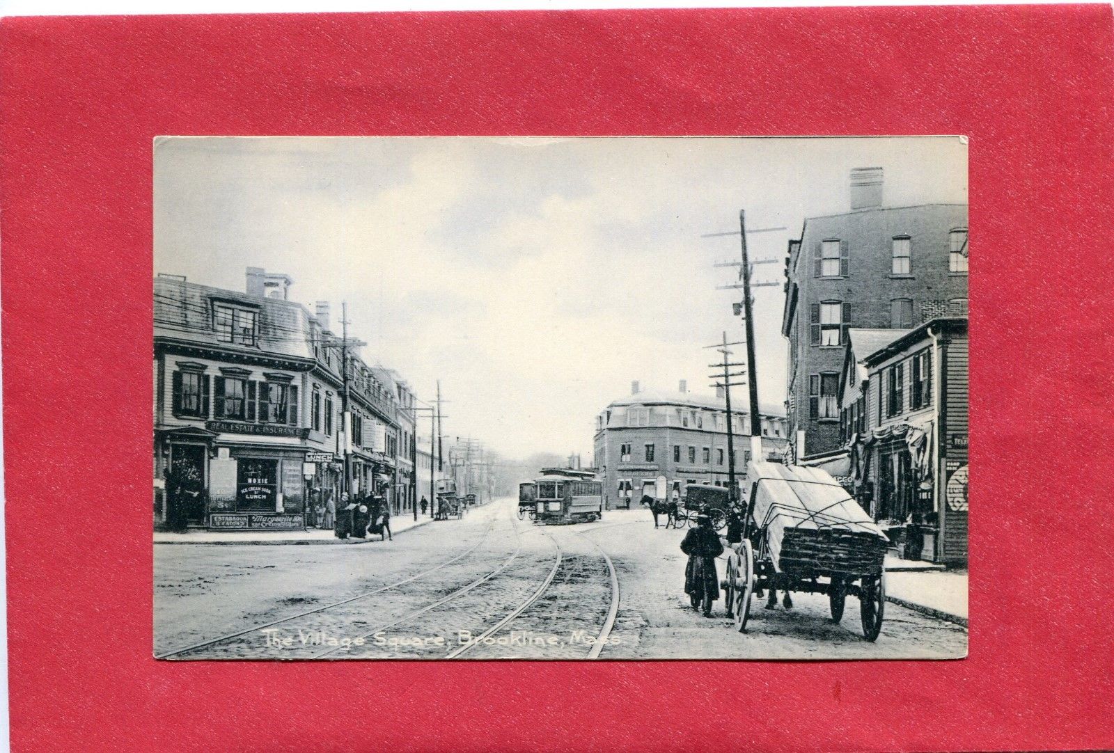 BROOKLINE, MA. VINTAGE POSTCARD, "VILLAGE SQUARE", TROLLEY, MOXIE SIGN, ETC.