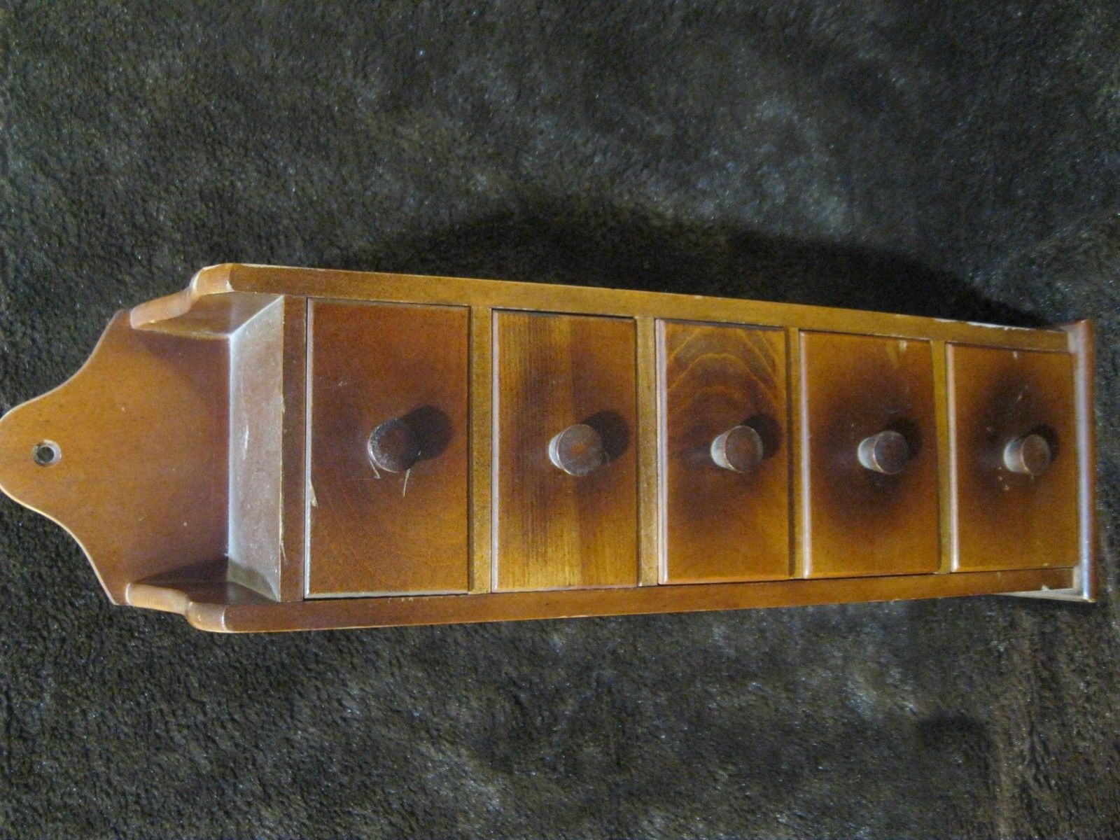 Title (ebay affiliate link): Wood Primitive Wall or Counter Cabinet 5 Drawers Spice-Sewing-Storage