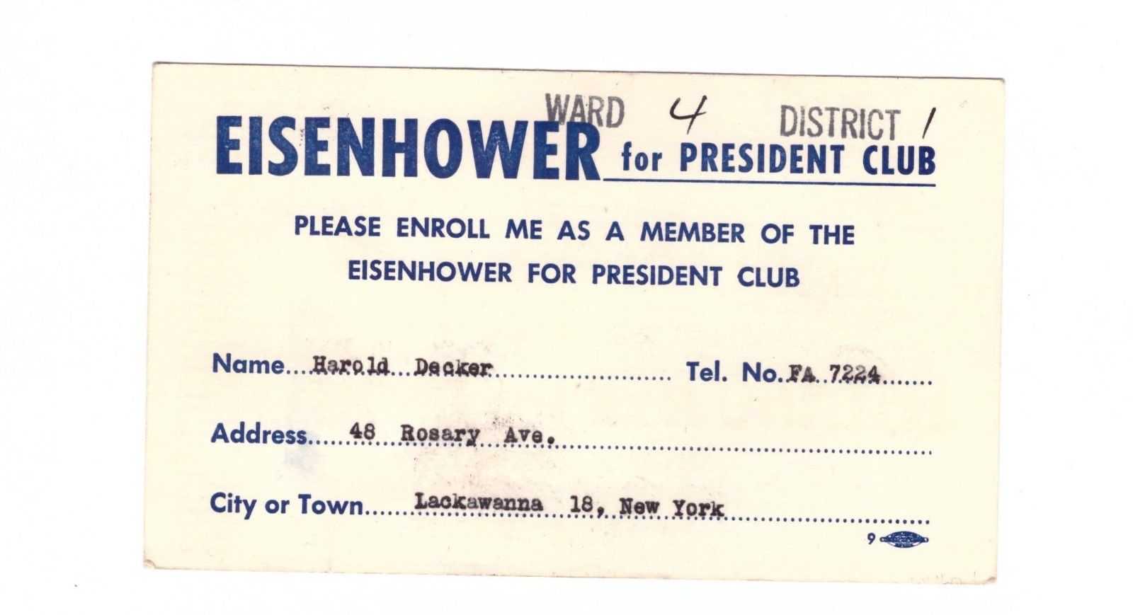 1952 Eisenhower FOR PRESIDENT CLUB LACKAWANNA NY POST CARD