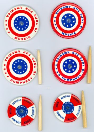Title (ebay affiliate link): 6 Vintage 1972 US Senators Humphrey & Muskie Political Campaign Spinning Tops