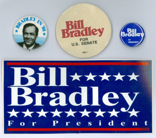 Title (ebay affiliate link): 2 Vintage US Senator Bill Bradley Political Campaign Pinback Buttons &2 Stickers