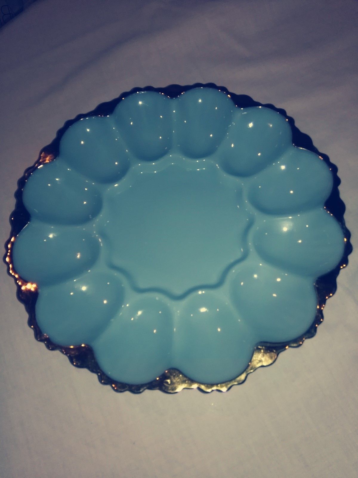 Title (ebay affiliate link): Anchor Hocking Fire King Aqua Delphite Blue Milkglass Egg Plate w/22K Gold Trim