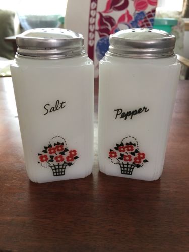 Title (ebay affiliate link): Vintage Tipp Milk Glass FLOWER BASKET TALL Patterned SALT & PEPPER SHAKERS