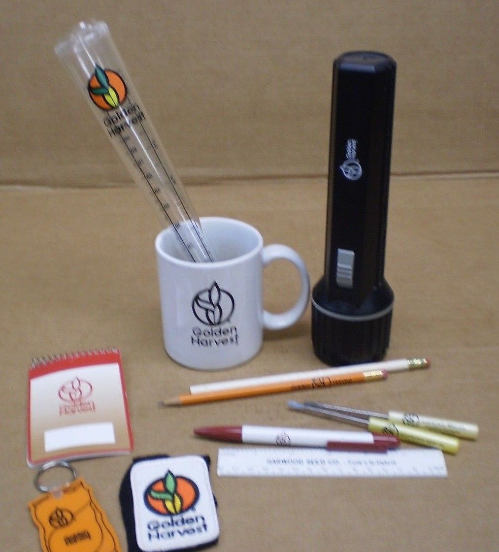 VINTAGE 12 PC LOT GOLDEN HARVEST KEYCHAIN PATCH SCREWDRIVER FLASHLIGHT RULER CUP