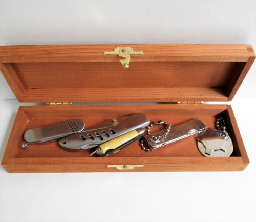 Vintage Folding Jackknife Collection In Wood Cigar Box Keychain Stainless Set 5