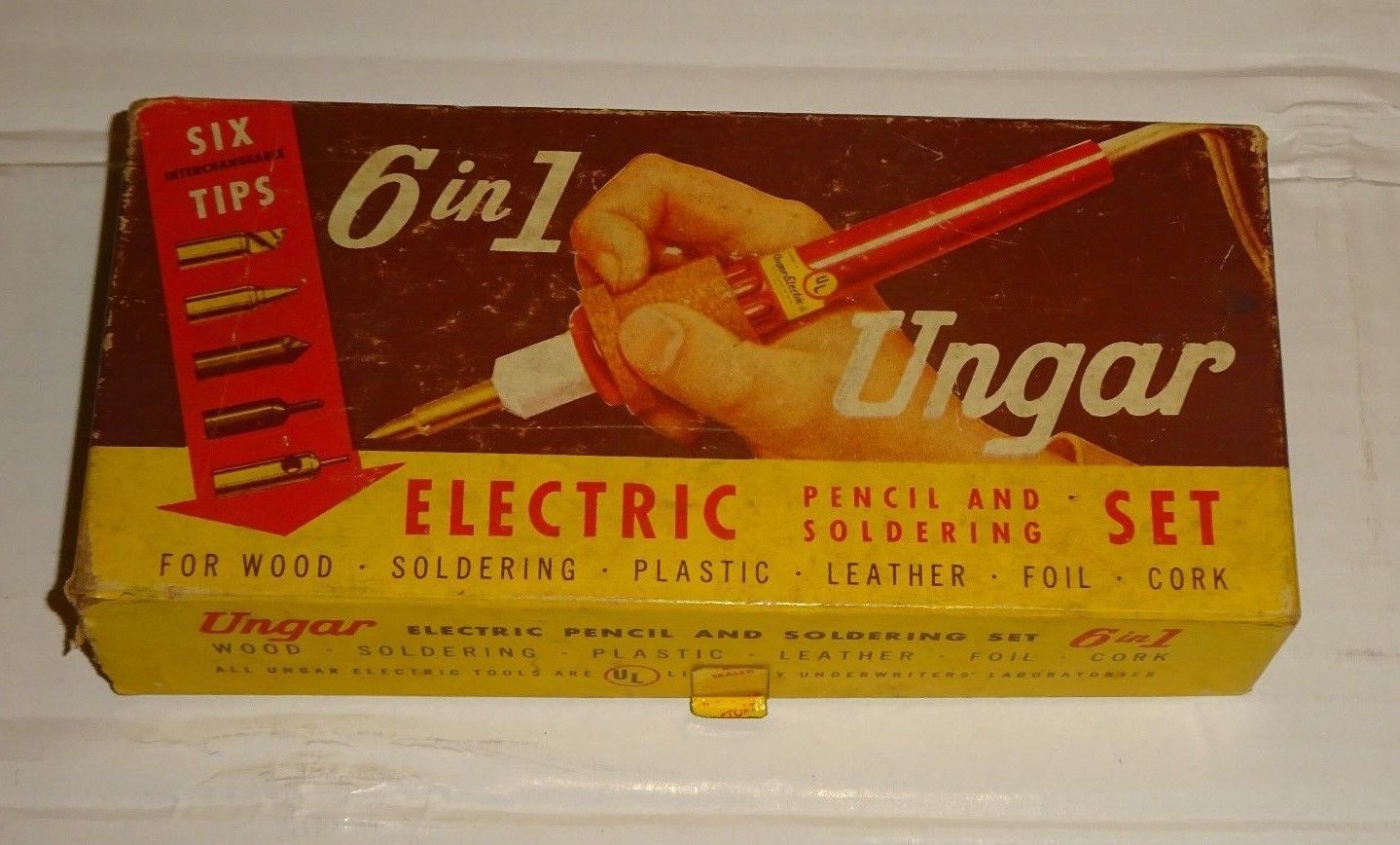 Title (ebay affiliate link): Vintage 6 in 1 ELECTRIC PENCIL & SOLDERING SET - Unger #217 with original box