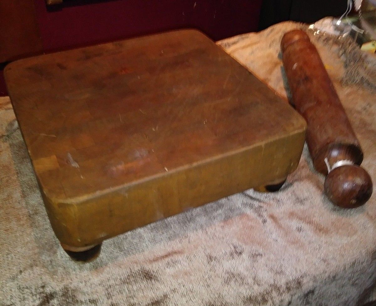 Title (ebay affiliate link): Antique set 11" Square Butch-R-Block butcher block cutting and rolling pin