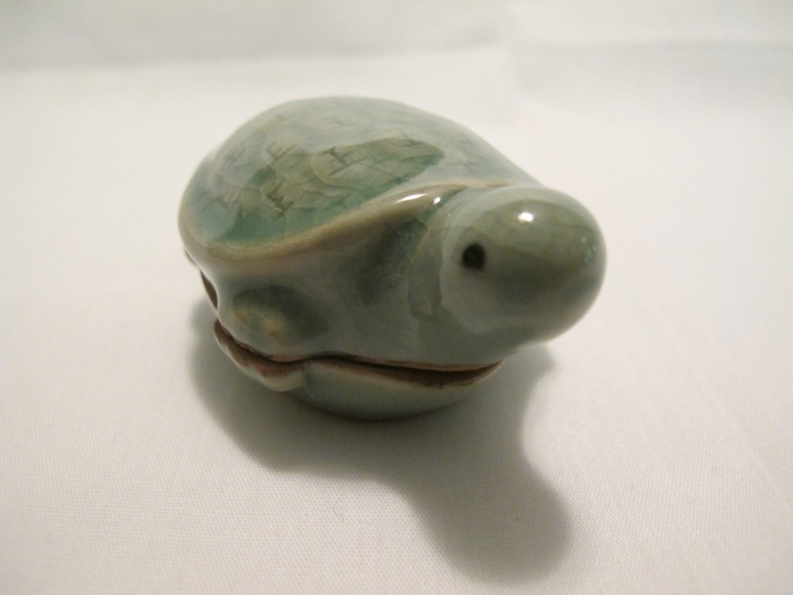 ANTIQUE PORCELAIN ASIAN TWO PIECE SMALL TURTLE TRINKET BOX SIGNED