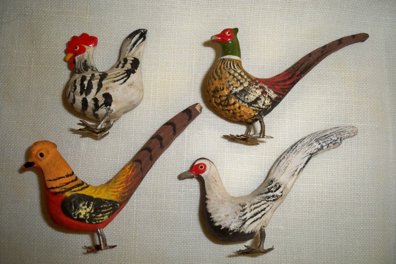 Title (ebay affiliate link): Antique composition 4 chicken, pheasant, birds GERMANY PUTZ Metal Feet Stick Leg