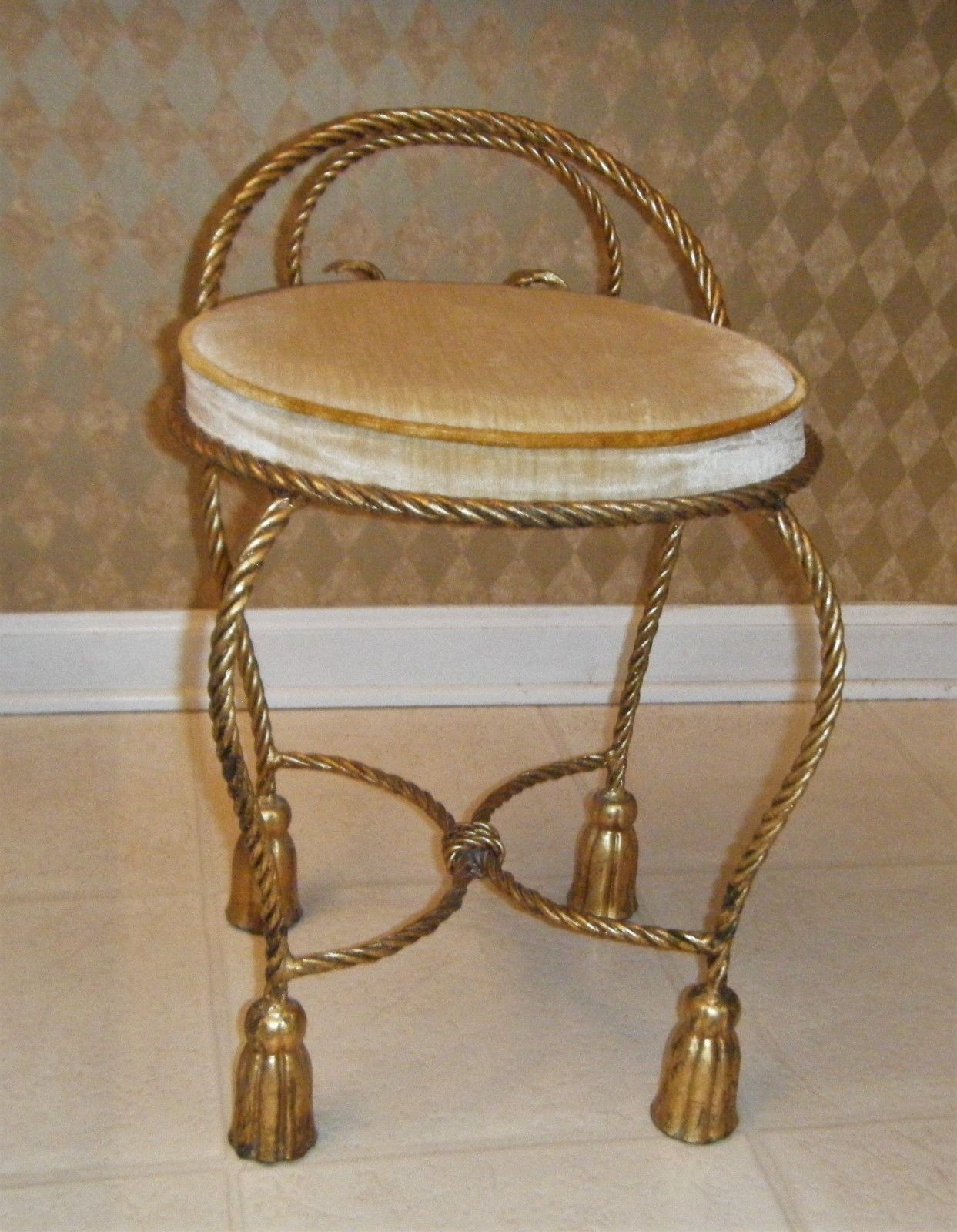 Title (ebay affiliate link): Vintage Hollywood Regency Florentine Gold Gilt Rope Tassel Vanity Chair Stool