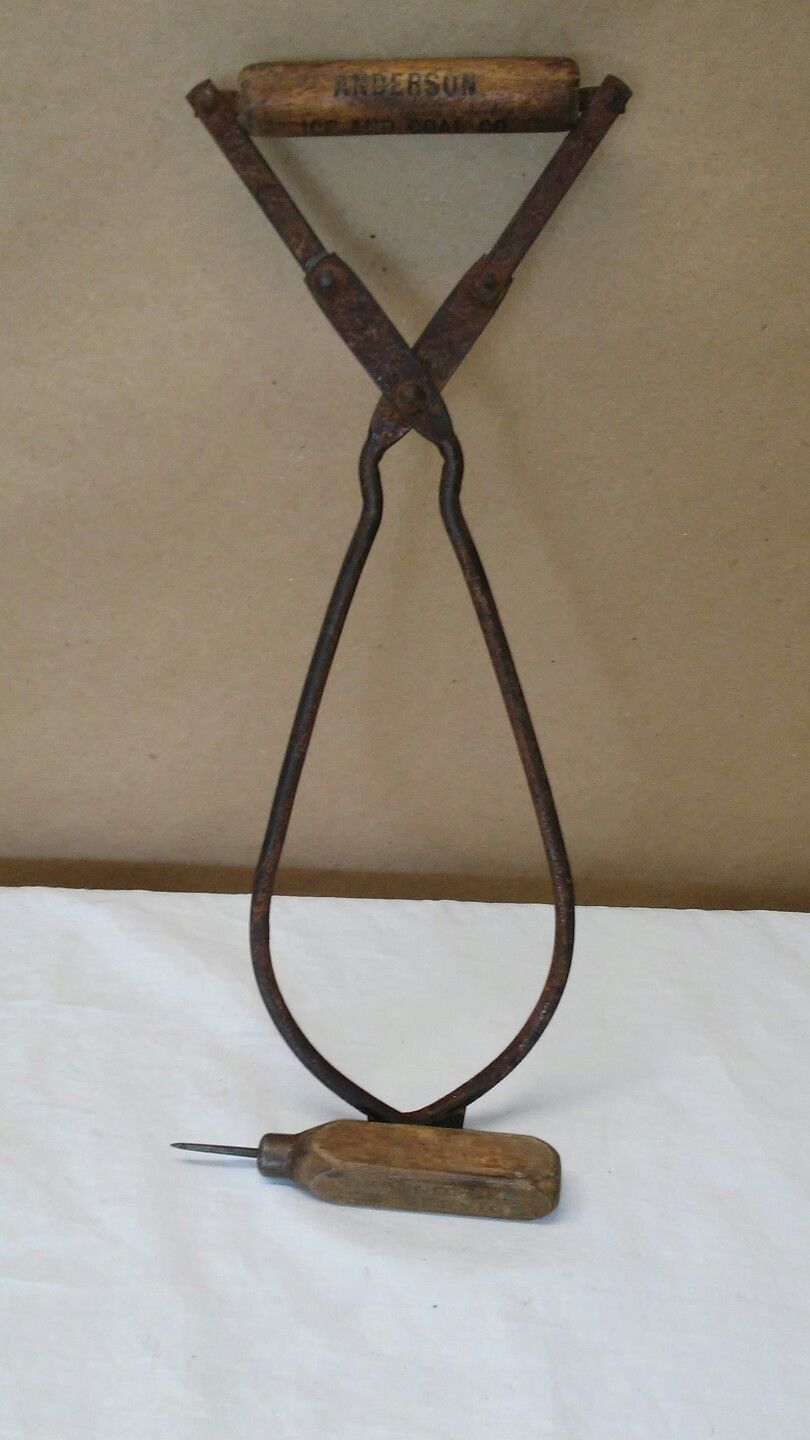 Title (ebay affiliate link): Vtg. BLOCK ICE TONGS/Carrier - Anderson Ice & Coal Co/ ICE PICK Primitive Farm