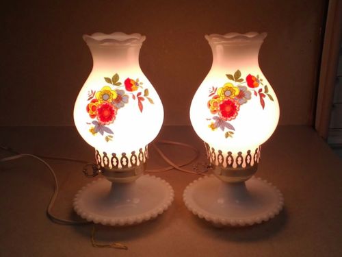 Title (ebay affiliate link): 2 Vintage White Milk Glass 11" Electric Hurricane Lamps With Colorful Flowers