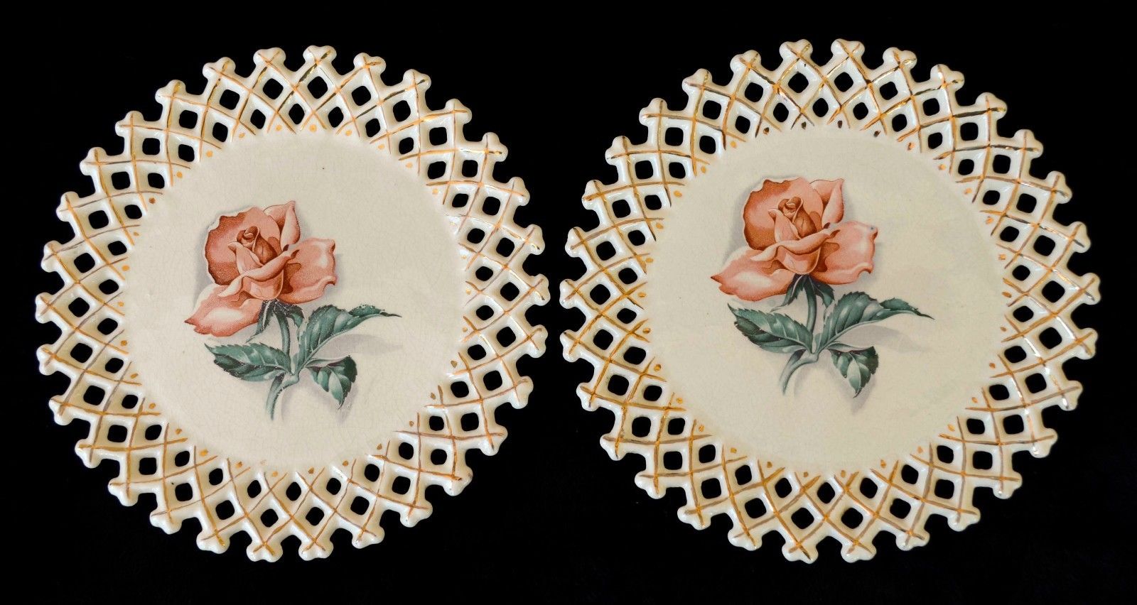 Title (ebay affiliate link): Vintage Decorative Plates set of 2 Roses Basket Woven Edges Gold Trim