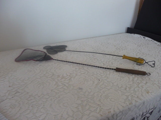 VINTAGE PRIMITIVE FLY SWATER WITH WOODEN HANDLE MESH AND METAL HANDLE LOT 2