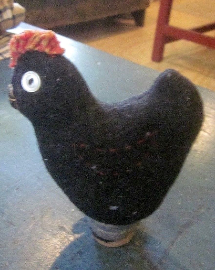 Title (ebay affiliate link): Sewing chicken pin cushion spool black wool red comb rooster? vintage