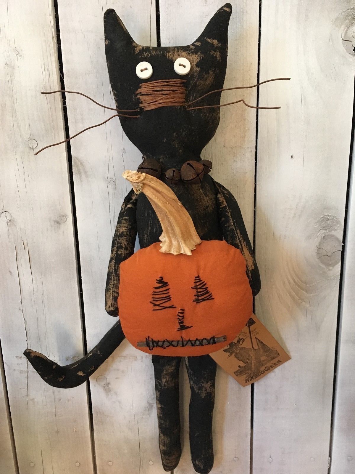 Title (ebay affiliate link): Primitive Halloween Cat Pumpkin Doll w Real Stem Folk Art Grungy Rusty Bells 19"