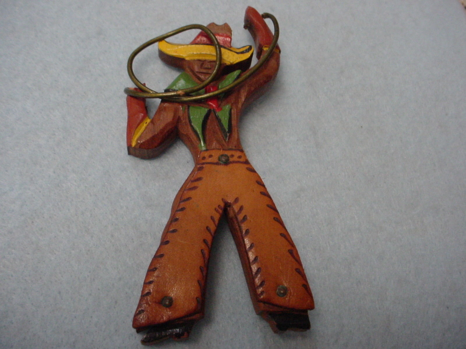 Title (ebay affiliate link): RETRO HAND CARVED WOODEN ENAMEL COWBOY WITH LARIET LEATHER PANTS - 4 1/8" HIGH