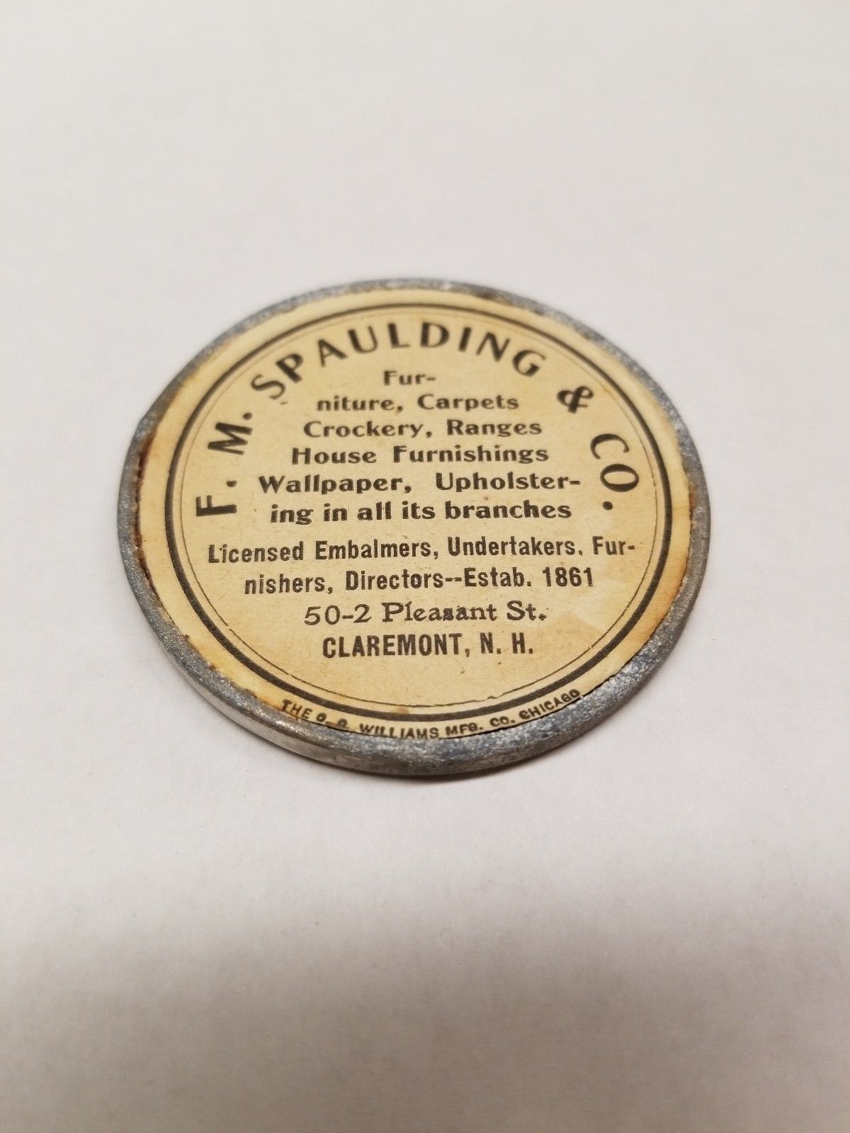 Title (ebay affiliate link): Antique Old Advertising Pocket Mirror, F. M. Spaulding & C0, Claremont NH