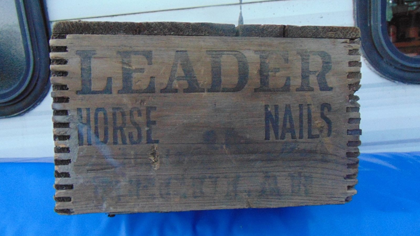 Title (ebay affiliate link): Antique LEADER Brand Wooden Horse Shoe Nails Box New Brighton PA. Wood