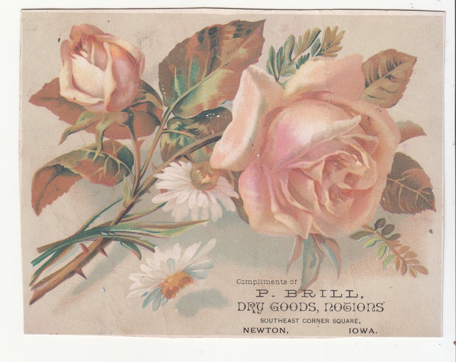Title (ebay affiliate link): P Brill Dry Goods Notions Newton Iowa Pink Rose Leaves Vict Card c1880s