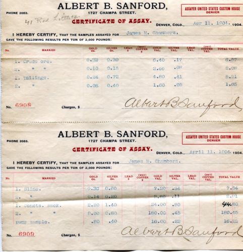 Title (ebay affiliate link): 1904 CERTIFICATE OF ASSAY Denver Co Albert B. Sanford ASSAYER US CUSTOM HOUSE