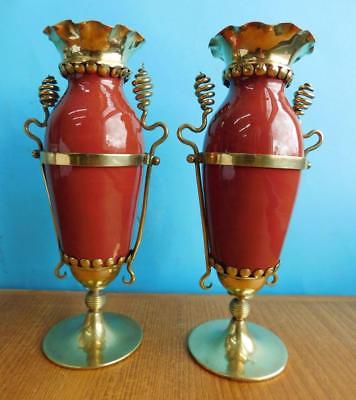 Beautiful Antique Brass Mounted ''German Art Glass Urn Vase Pair c1900s