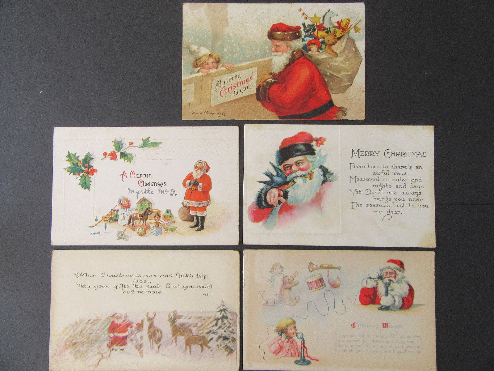 5 Santas, Christmas, 1 Clapsaddle, Bag, Toys, Reindeer, Children, Stocking, #21