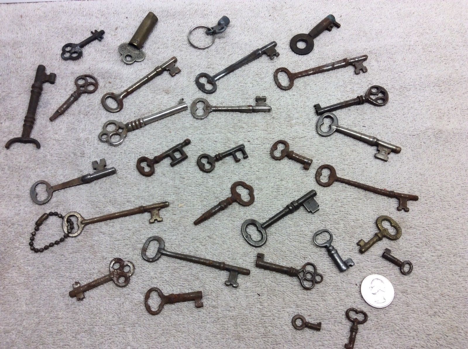 Title (ebay affiliate link): Lot of 30 Antique Vintage Keys Skeleton Furniture Barrel Key Cabinet Clock tiny