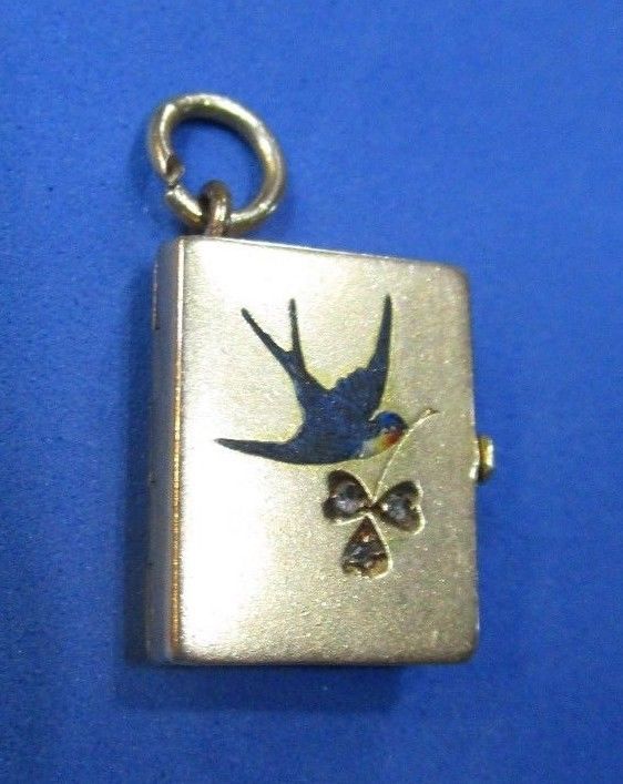 Title (ebay affiliate link): Antique Depose France Book Charm diamond enamel bird opens to magnifier 18K GF