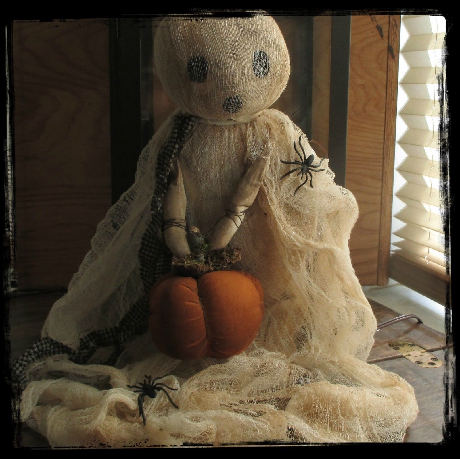 Title (ebay affiliate link): LAST ONE Primitive Halloween Ghost Doll Door Hanger Orange Pumpkin Harvest Decor