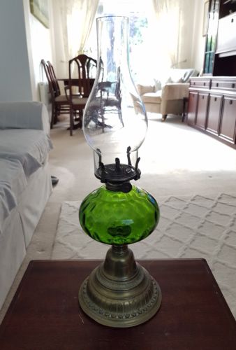 Title (ebay affiliate link): Antique Oil Lamp With Green Glass Font And Brass Base